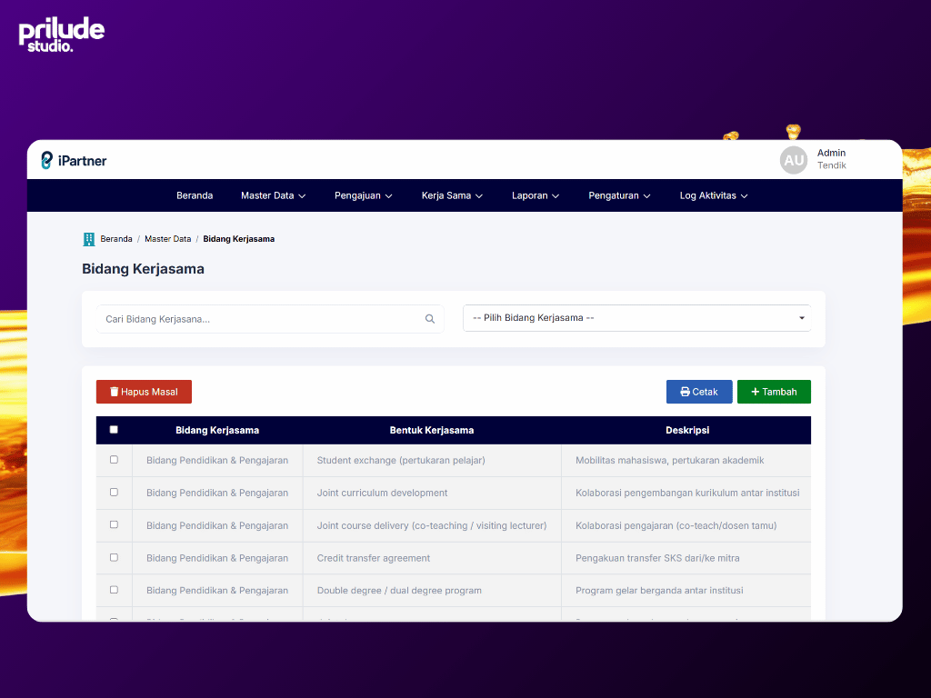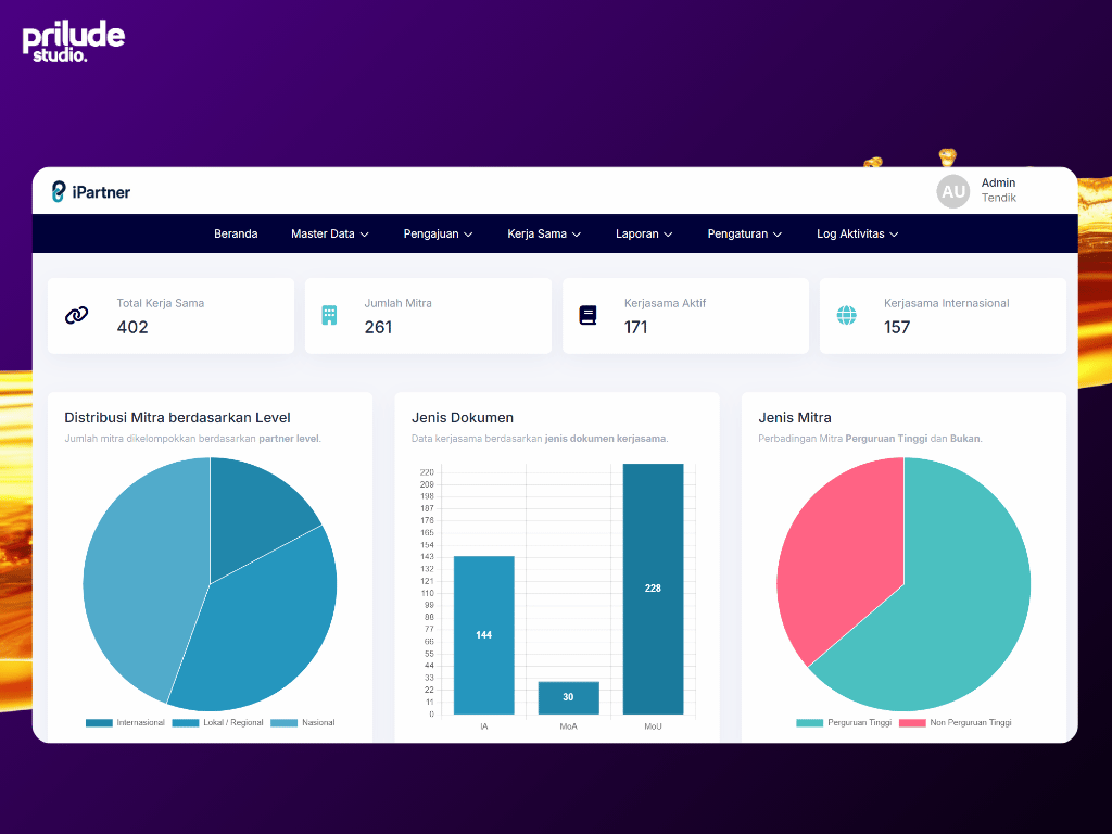 Sistem ini menyediakan fitur pengelolaan data mitra kerja sama, pengelolaan dokumen kerja sama seperti MoU dan MoA, serta pencatatan kegiatan kerja sama yang dilakukan oleh institusi.